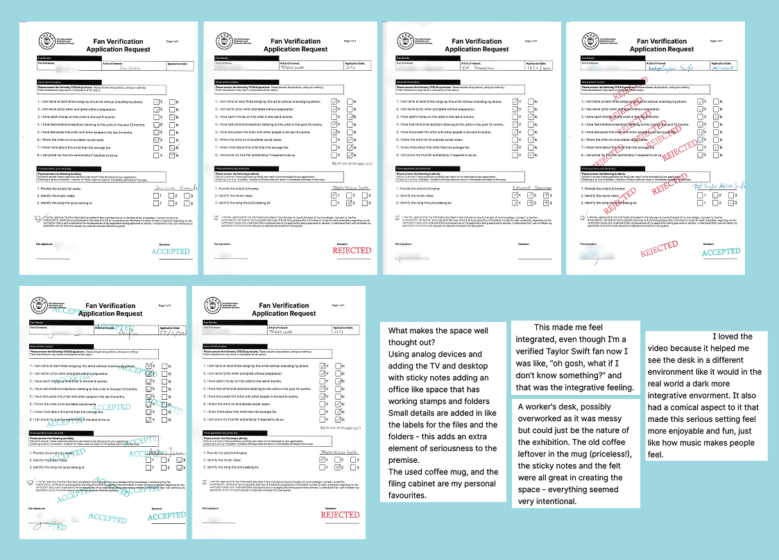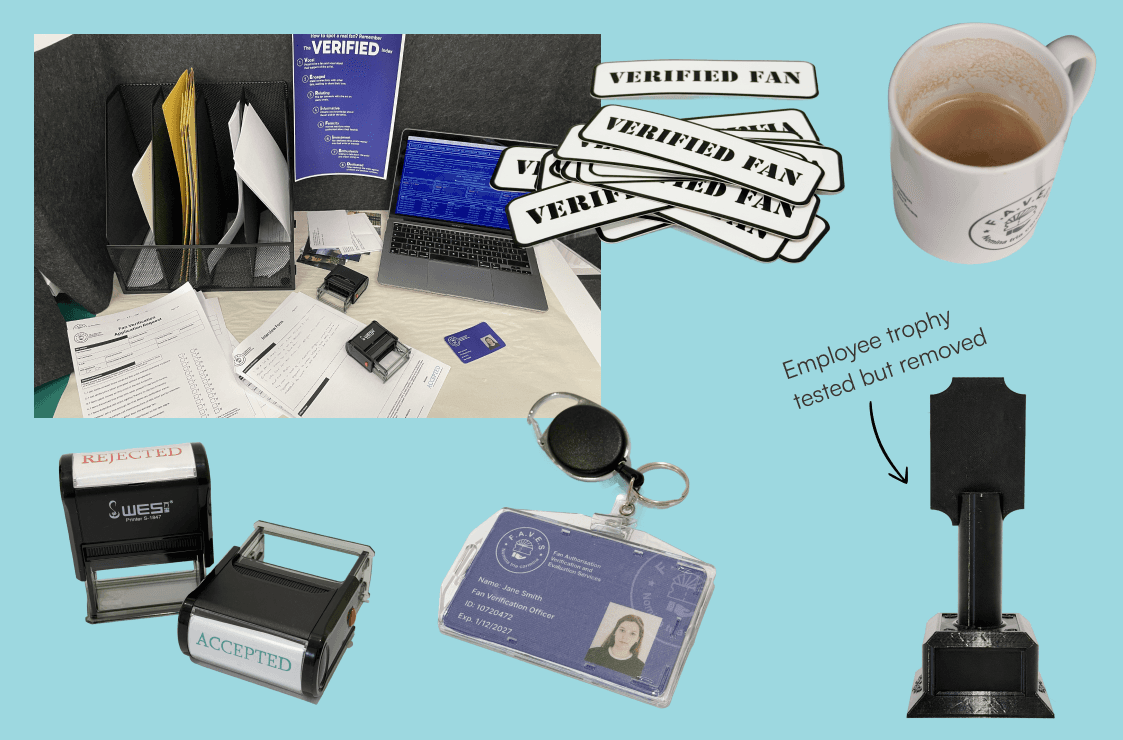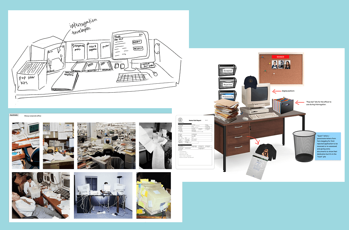 Mundane, bureaucratic and tedious - every object was chosen to reinforce that assessing fans is just another day in the office for this officer, drowning in paperwork. It's detached from emotion and therefore was perceived as bias-free and clinical.