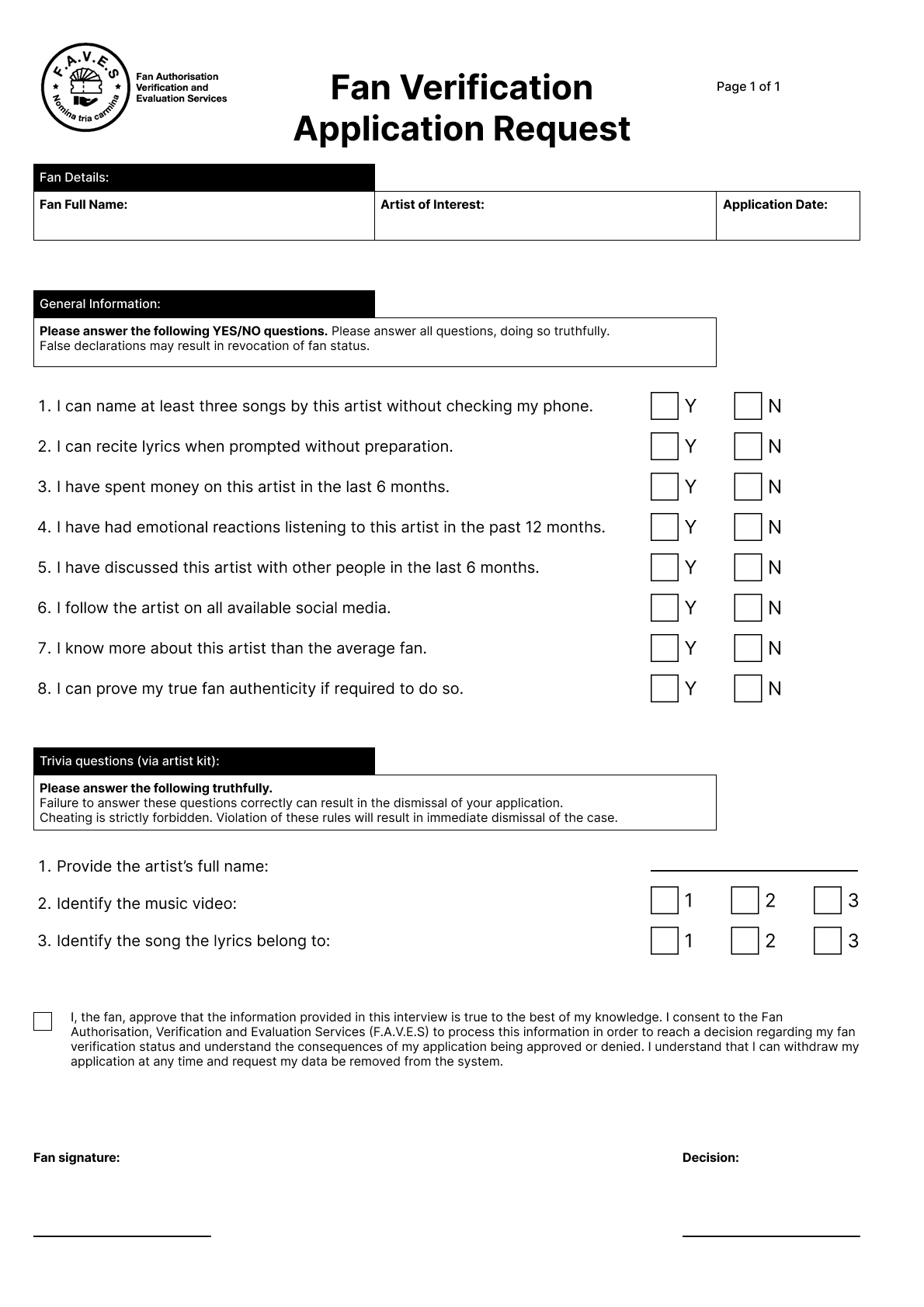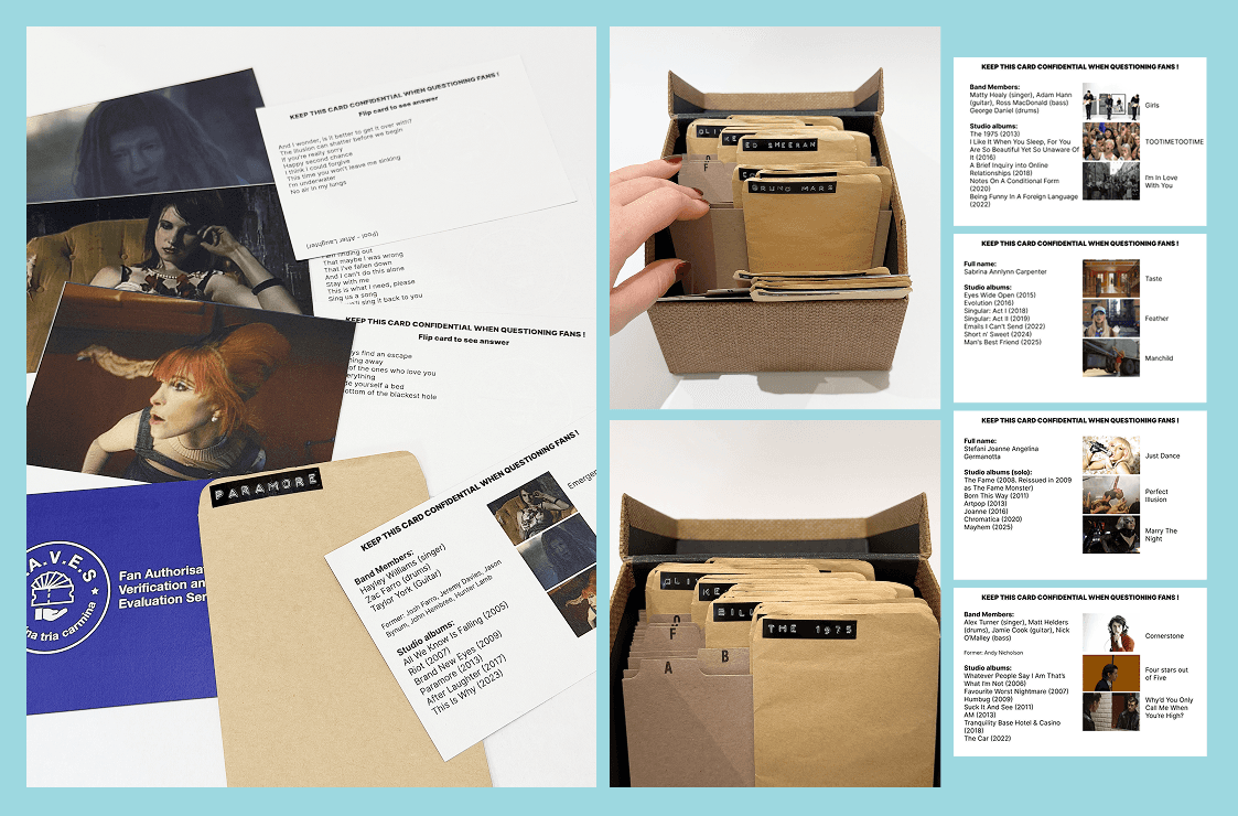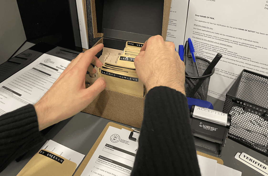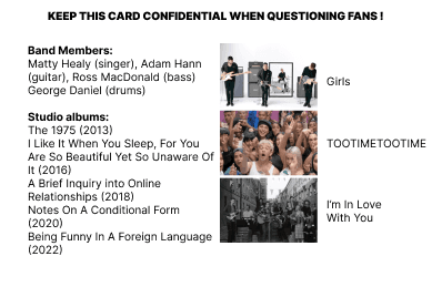 To avoid fan-on-fan bias, the officers are not fans themselves. Instead, they rely on a "cheat sheet" that includes information every fan should know, like album names and music videos.