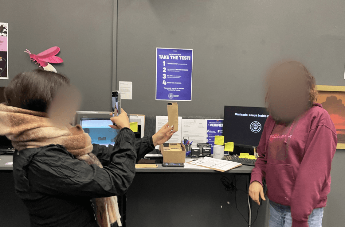The goal for this desk design was to communicate the story, and be inviting enough to encourage participation. Several artefacts were planned and removed because they were too confusing or obstructed attention.